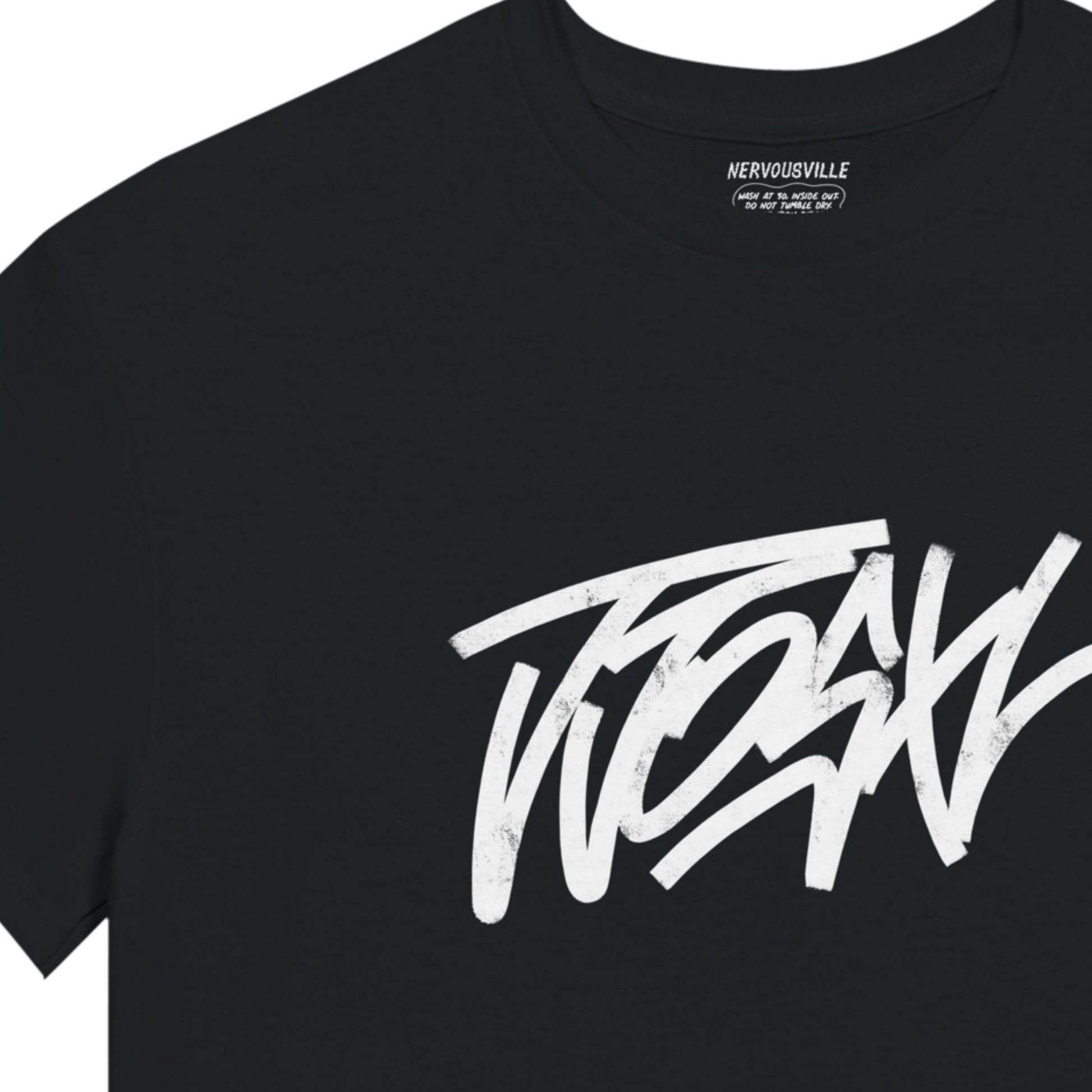 If you know then you know. It's a classic fit black shirt featuring a raw tag design in white. *Note; this shirt has a worn effect to the design. It is not a printing defect.